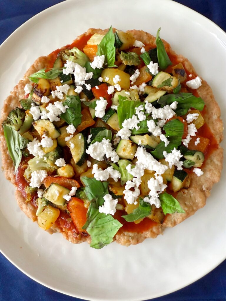 (detox pizza with ground chicken crust, lots of veggies, and tofu *cheese*)