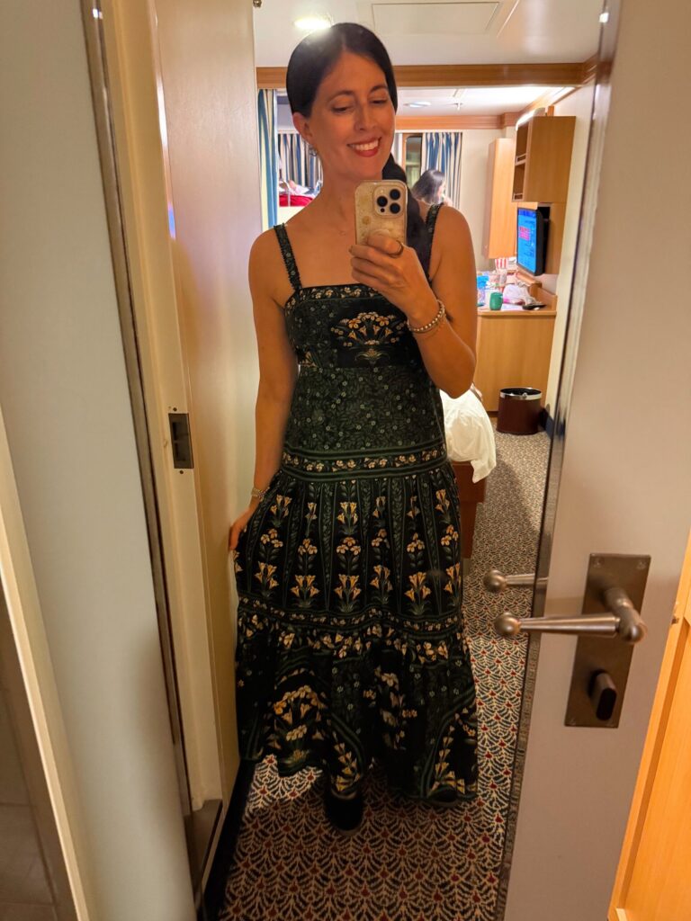 For cruises, I usually bring something comfy during the day, especially since I might work out. So I’ll wear lululemon and a Disney hoodie or pullover on the ship. At night, I’ll change for dinner into a dress and either a lightweight jacket, or a dress that has sleeves because it’s always a little bit chilly at night.
